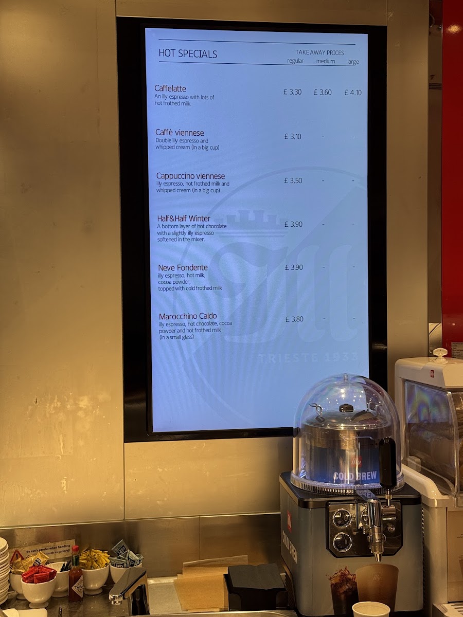 The menu at Illy Caffè in London offers a delightful range of beverages, especially for coffee and chocolate lovers. For a classic espresso experience, you can choose from Espresso Illy (£2.20), Espresso Illy Doppio (£2.60), or the milder Espresso Illy Lungo (£2.50). If you prefer a creamy touch, the Espresso Illy Macchiato (£2.60) or Double Macchiato (£3.00) provides a rich option. For those with a sweet tooth, their hot chocolate selection includes Hot Chocolate (£3.20) and Hot Chocolate & Whipped Cream (£3.80), both comforting choices. The Mocha (£3.90) is a must-try for a chocolate-coffee fusion, while the Marocchino Caldo (£3.80) and Onda Al CioccolatoNeve Fondente (£4.00) offer indulgent chocolate specialities. The menu also features the Half & Half Winter (£3.60) for a cozy treat. If you're after something different, the Chai Latte (£3.50), Caffe Viennese (£3.90), and Coccola Al Caffe (£4.00) will provide a unique twist to your usual coffee selection. The Cappuchino Viennese (£3.80) rounds out the hot specials, ensuring there's something for everyone.